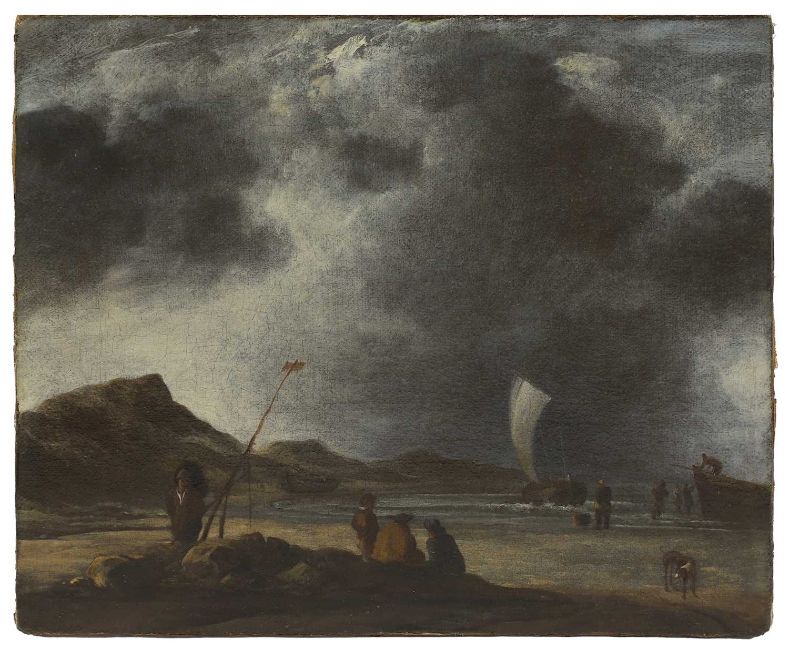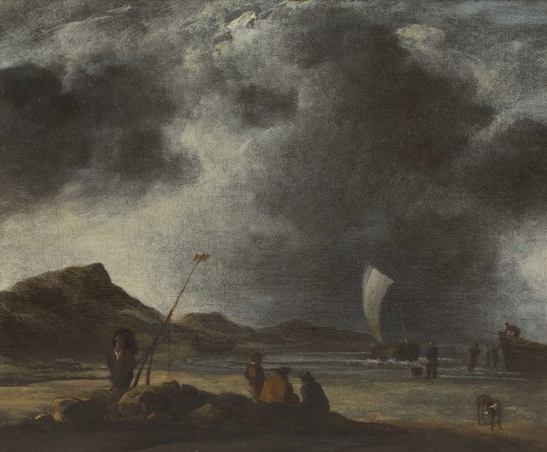 A coastal scene with fisherfolk and boats under stormy skies