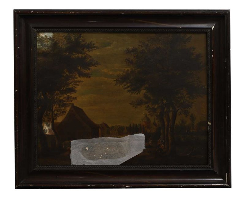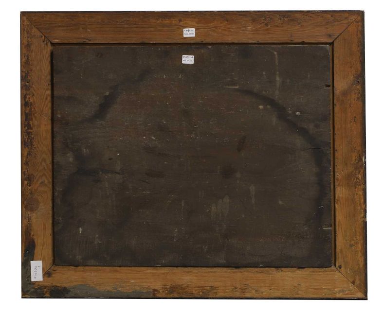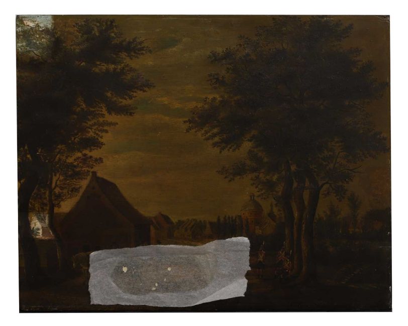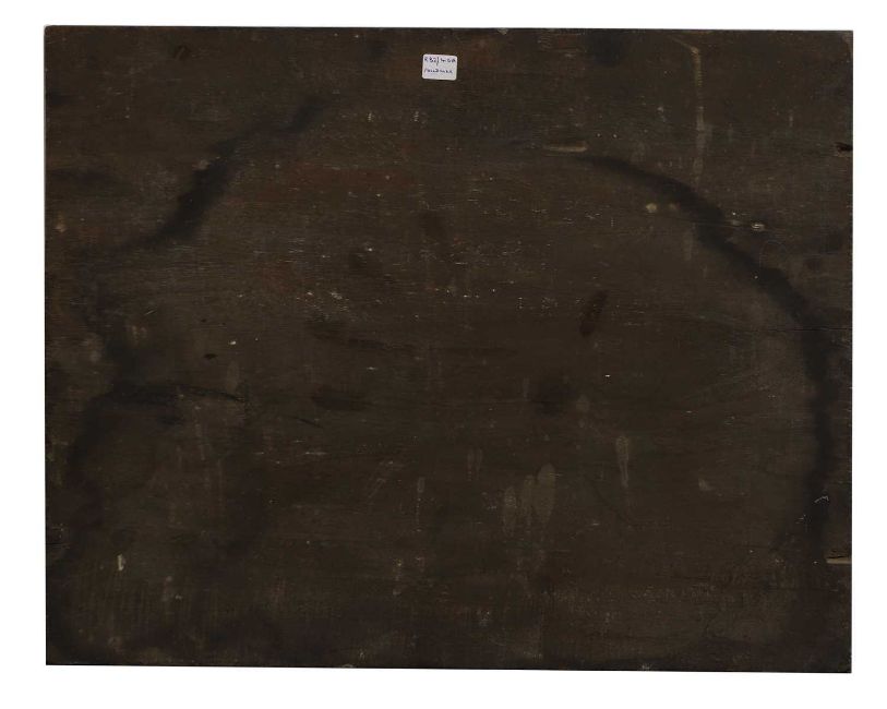 The is a 6cm split to the panel in the centre of the left edge. The panel has a small loss to the upper right corner and is slightly bowed in the centre. Surface dirt and discolouration. There are two brighter areas where the painting has been selectively cleaned in the upper left corner and to the left edge, lower centre. There is a patch of overpaint to the centre of the right edge. Under UV light much of the surface is obscured by a thick layer of varnish, however some areas of overpainting are visible to the background and sky. The paint has been faced and consolidated in the lower centre.
