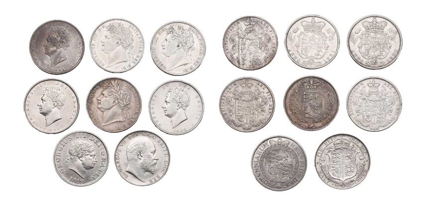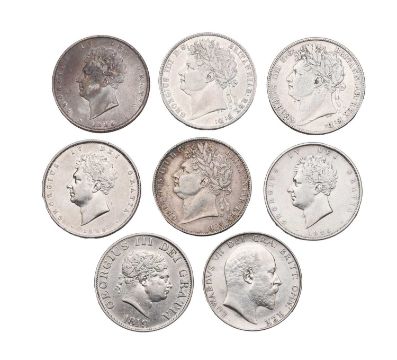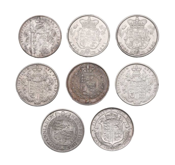 a collection of Halfcrowns comprising a George III 1819 example, VF or better, cleaned, 1 x 1820, F, 1 x 1821, heavier shield garnishing, NVF, cleaned, 1 x 1823, second reverse, VF or better with light toning, 2 x 1825, both F, 1 x 1826, VF, cleaned and 1 x 1902, NEF with surface checking and possible cleaned