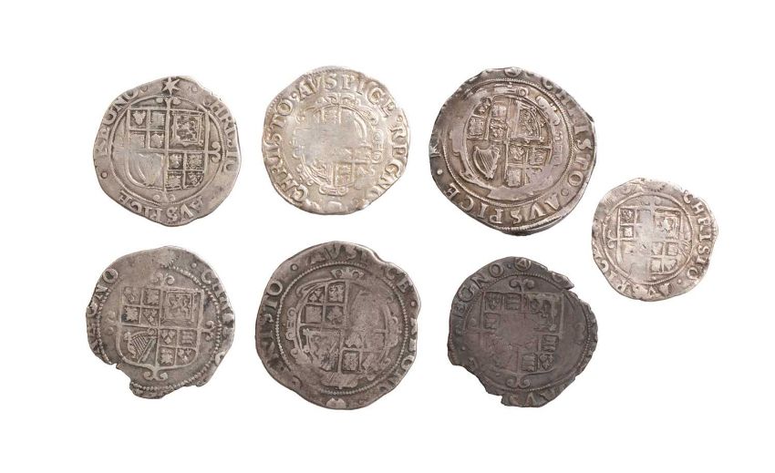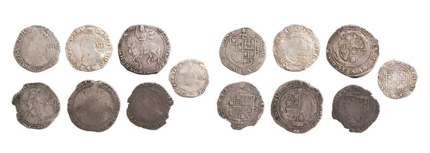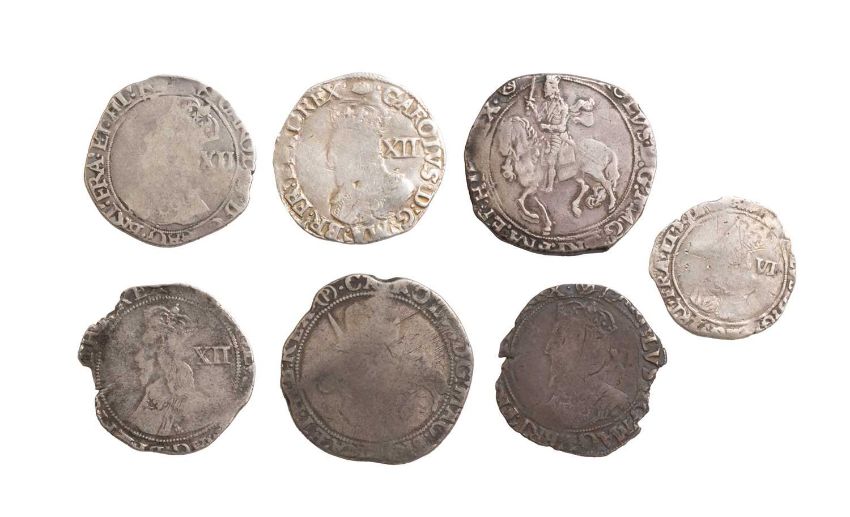 a selection of coins including a Halfcrown, Tower Mint under Charles I, mm. triangle in circle (S. 2779), NF with losses to/clipped edge, a Halfcrown, under Parliament, mm. (P), rubbed, together 4 x Shillings and 1 x Sixpence, all rubbed
