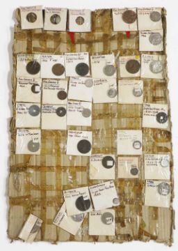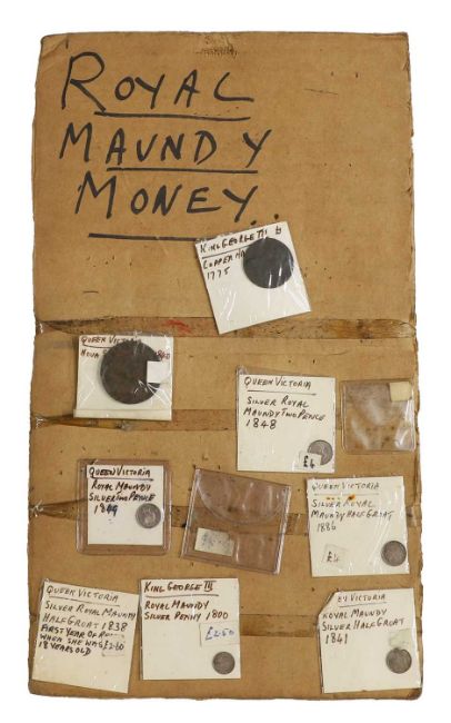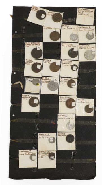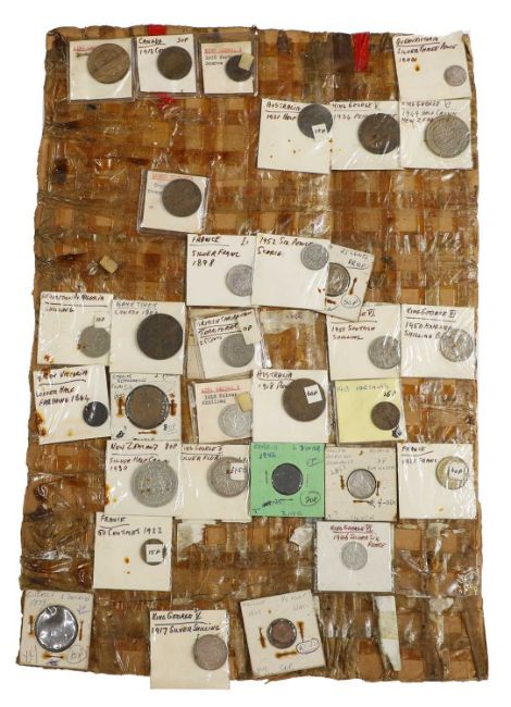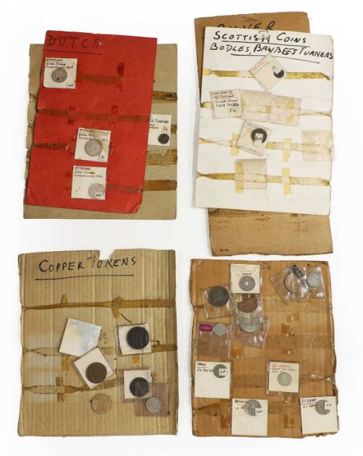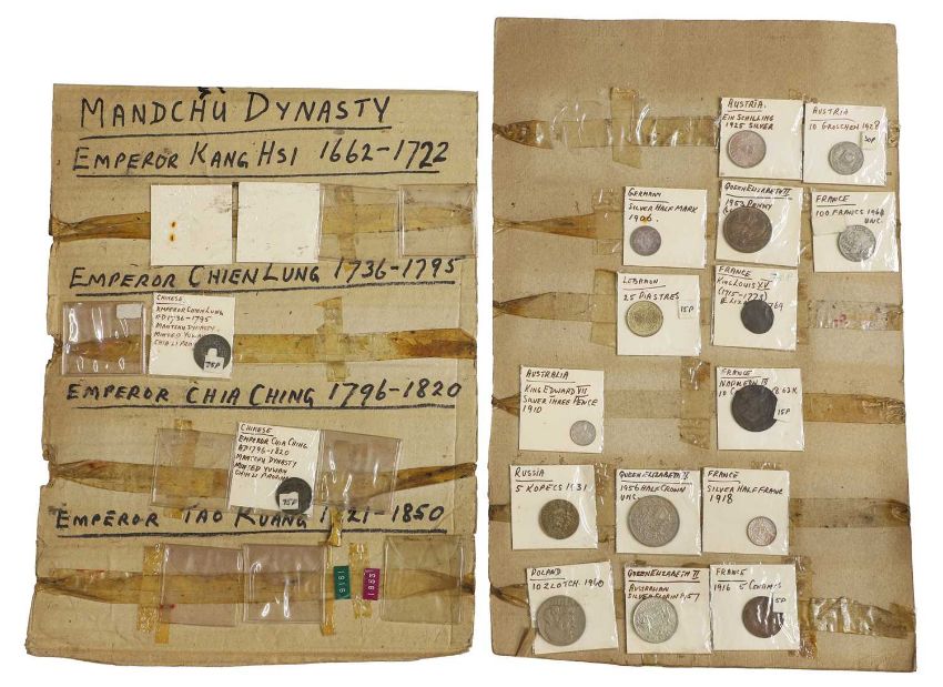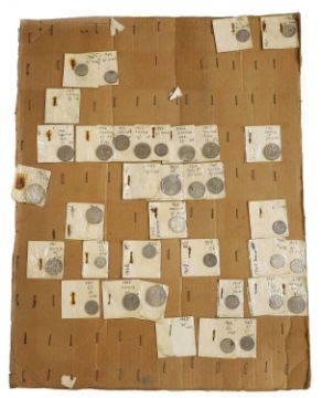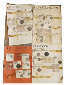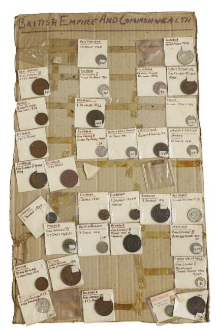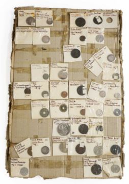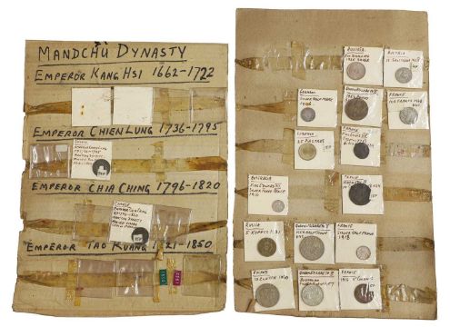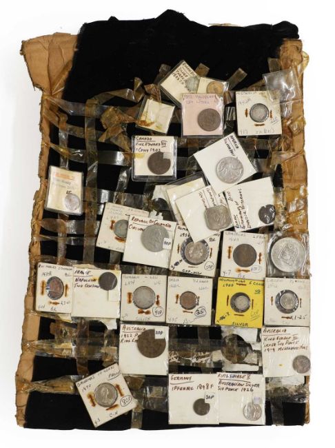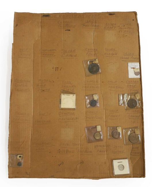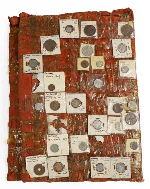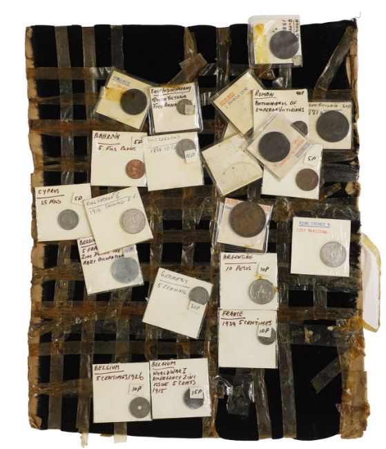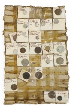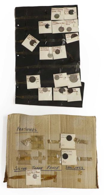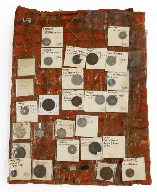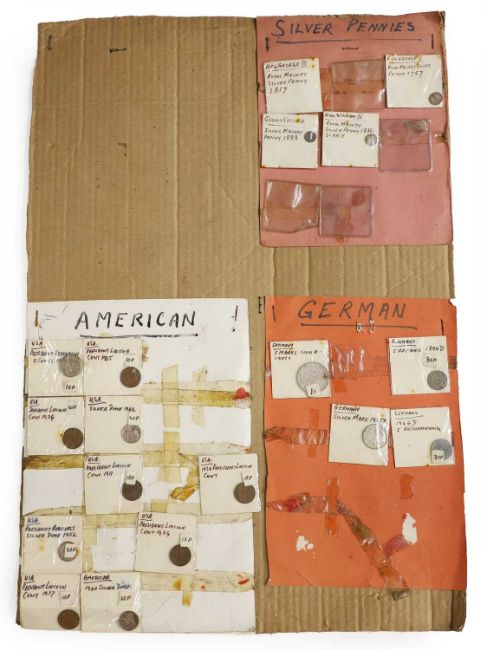 an assortment of coins, many taped to cardboard, including Halfcrowns, Dollars, Lire and a large quantity of 1965 Twopences, AUNC with full lustre