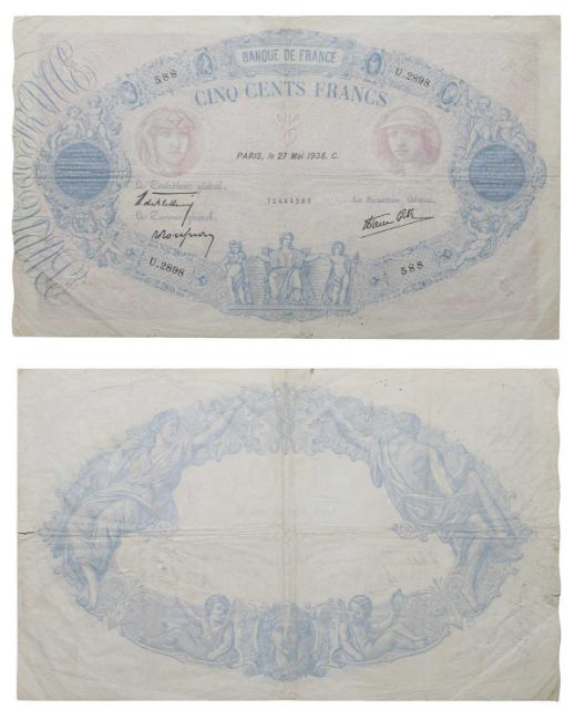 Banque de France, Cinq Cents Francs, 1938, serial number U.2898 588, F with creases, tears and pinholes