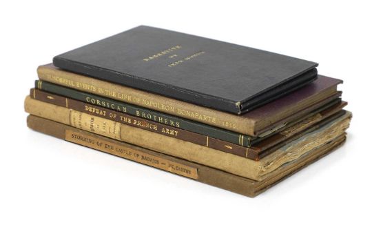 1- Giraud, P. F. F. J: The Campaign of Paris in 1814: To Which is Prefixed a Sketch of the Campaign of 1813; or, a Brief and Impartial History of Events from the Invasion of France by the Foreign Armies to the Capitulation of Paris and the Dethronment and Abdication of Buonaparte. L, printed for Samuel Leigh, 1815, 1st. edn. With Two large folding Maps. PP: viii, 143. Original paper backed plain boards and paper label, VG; 2- MacCarthy, Captain: Recollections of the Storming of the Castle of Badajos; By the Third Division a Personal Narrative, by Captain MacCarthy to Which Are Added Memoires ... of Corunna. L, Published by W. Clowes & sons, Second Edition. PP: (vii) Including list of Subscribers, (i) blank, (v)-viii, (9)-100, (v), (i) blank. Original paper backed plain boars & paper label; rubbed; 3- An Account of the Most Striking and Wonderful Events in the Life of Napoleon Bonaparte: From His Sailing from Elba to His Landing at St. Helena. Comprising a Circumstantial Description of the Memorable Battle of Waterloo and of the Singular Island to which the Ex-emperor Has Been Banished. Embellished with a View of St. Helena. Newcastle, Printed by Mackenzie and Dent, 1816, 1st. edn. With a folding view of St. Helena and a plan. PP: 119, (i), 8, (iv); 4- Barker's Panorama: A description of the defeat of the French army under Napoleon Bonaparte, by the allied armies, commanded by The Duke of Wellington & Field Marshal Prince Blucher, in front of WATERLOO, on the 18th. Of June 1815; now exhibiting in BARKER'S PANORAMA, Strand, 1816. 12pp Plus a large folding plate (small tear to margin). Later 3/4 leather over marbled boards; 5- The Corsican Brothers; or, the Atridae. To which is added, Robespierre and Buonaparte; or the two tyrants. London, J. Johnson, 1814, 1st. Edn? PP: (ii) Title page, 5-35, (ii) Adverts. Later cloth backed marbled boards, vg; 6- The narrative of Jean Hornn, military coachman to Napoleon Bonaparte: containing his recollections of that memorable character, during the ten years in which he was in his personal Service, London Museum, 1816, 2nd. Edn. With a large folding engraved frontis plate. PP: (iv), 68. Original wrappers with paper label to upper cover, housed in a specially made fold around covers. (6)