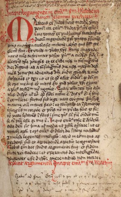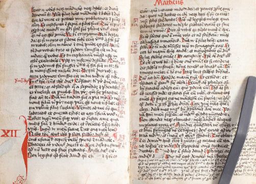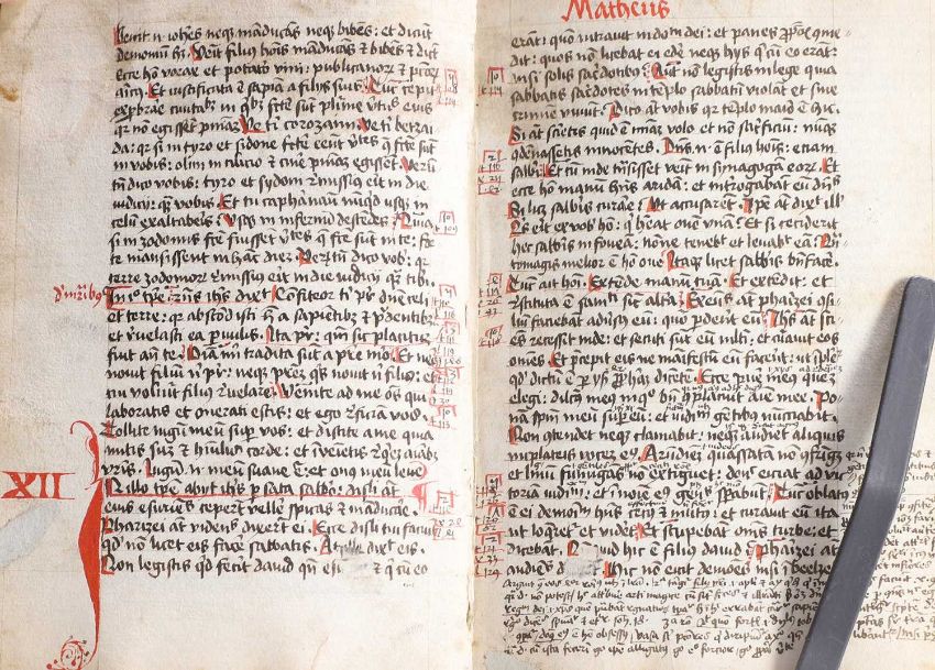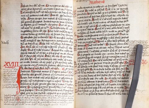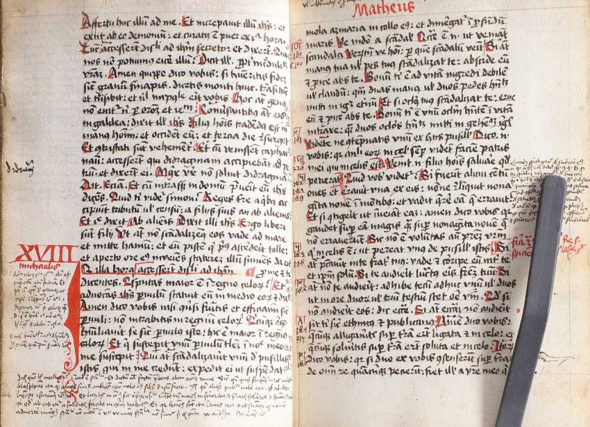 191 leaves in red and black lettering, 29 lines per page, 99 pages with annotations. The order of the Gothic Latin version of the gospels in Matthew, Mark, Luke & John, the margins of their pages are adorned with miniscule Gothic Latin (exceptionally abbreviated) notes in a neat hand, all in black ink. At the end of John, the pages are numbered in red ink 1-84 (Gothic numbers, e.g. 1L=74). Leaves 1-15 Paul's letter to the Romans; 15-35 Corinthians; 36 etc. other epistles. The volume is complete, bound in full brown morocco over oak boards with blind stamps of a convent, an 18th. Century silver-gilt chased clasp, light damp stain to bottom margin of the last 20 leaves, otherwise very good. This unique manuscript was in the library of the Duke of Sussex; it was bought by Quaritch in 1878.