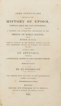 The Post And The Paddock. L, Piper, Stephenson & Co., (1856). Cont. half bound, rubbed; [Henry Pownall], An Inhabitant: Some Particulars Relating To The History of Epsom, Compiled From the Best Authorities Containing A Succinct And Interesting Description Of The Origin Of Horse Racing And Of Epson Races, With An Account Of The Mineral Waters,.. L, W. Dorling, 1825, 1st. edn. With 6 engraved plates, including the hand-coloured frontis. PP: xiv (includes the Subscribers' list), (ii), 208. Original boards, rubbed; scattered spotting; Pond, John: The Sporting Kalendar. Containing a Distinct Account of what Plates and Matches have been run for in 1754. Printed by G. Woodfall, (1755). Original full leather and later spine; Blew, William C A; Henry Alken (ill): A History of Steeple-Chasing. L, Nimmo, 1901, 1st. Edn. With 12 hand-coloured plates and numerous head and tailpieces; 'Cecil' (Pseud of Cornelius Tongue): Records Of The Chase And Memoirs Of Celebrated Sportsmen. 1854, 1st. Edn. With 2 engraved plates. 3/4 bound, rubbed; Richardson, John Maunsell and Mason, Finch: Gentlemen Riders Past and Present. 1909, 1st. 4to. Original 3/4 bound; Plus 4 others. (11)