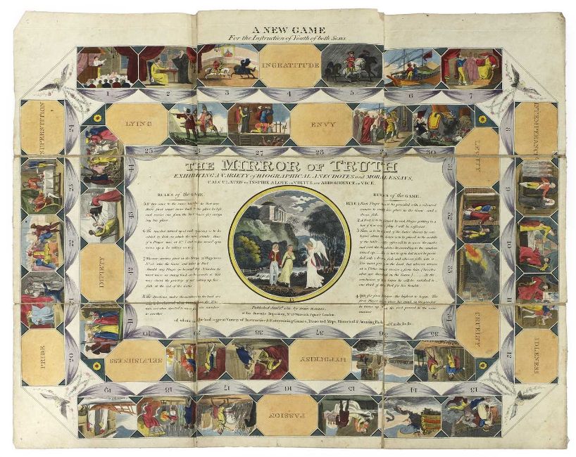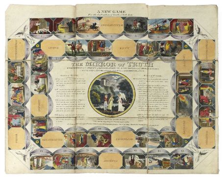 A new Moral and Biographical Game. London: J Wallis, 1811. Hand-coloured lithographed dissected into nine sections, linen backed and folding into the original pictorial slipcase. (56 x 46 cm), The slipcase rubbed