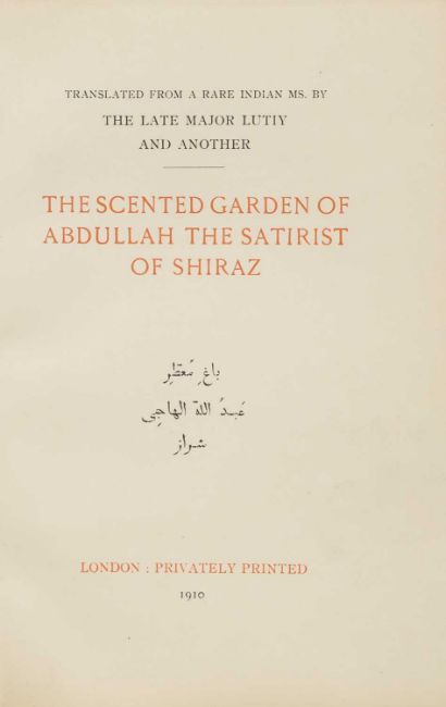 The Scented Garden of Abdullah the Satirist of Shiraz [The Bagh-i-Muattar]. London: Privately Printed, 1910. First Edition. Full vellum, lacking the ties & dust soiled and warped.