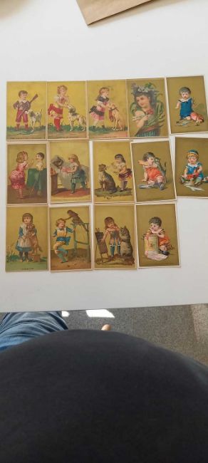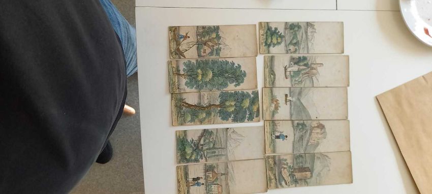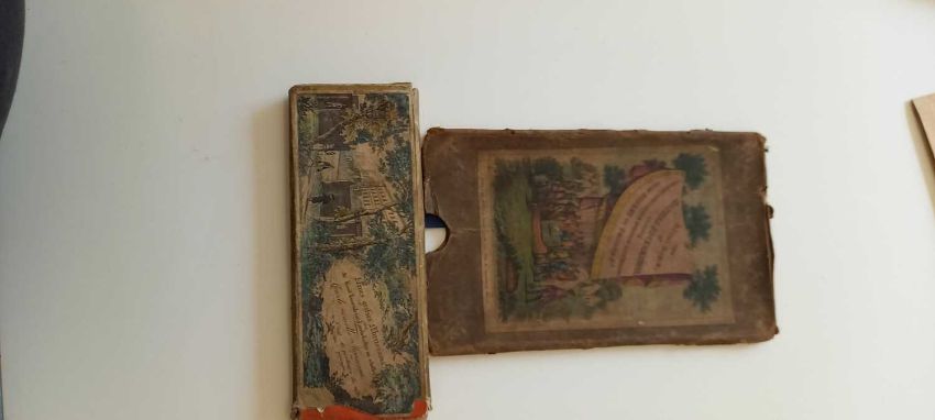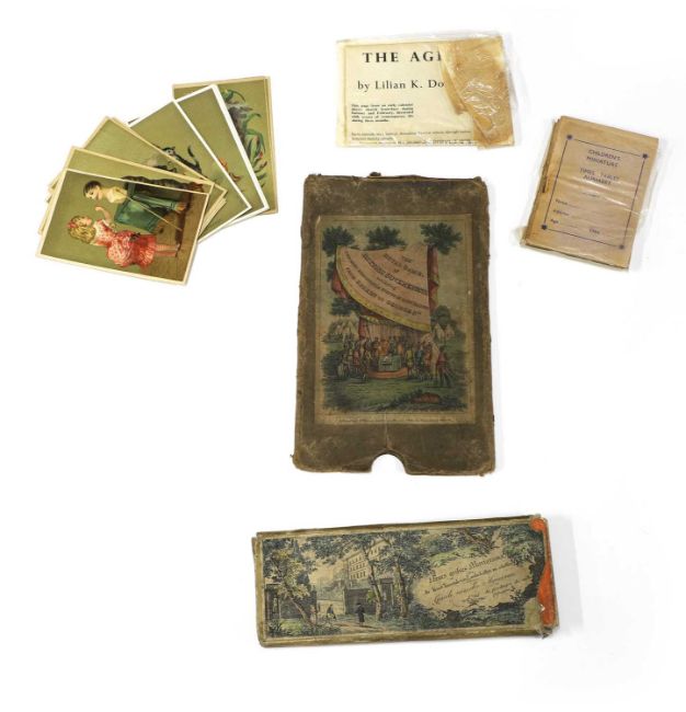 Neues grosses Myriorama, oder die kunst tausende von landschaften zu schaffen: Grande nouvelle Myriorama, ou L'art de prodruirre de mille pansages. Hand-coloured aquatint cards numbered 1-10, in the original titled pictorial slipcase. Small damage to the slipcase; Plus: Five children's miniature books: Times table/Alphabet; Nursery Rhymes/School reports/School register; Arithmetic book; Writing book; & Drawing book. Fine copies; PLUS; 14 colour lithograph cards - children at various activities; PLUS: one other.