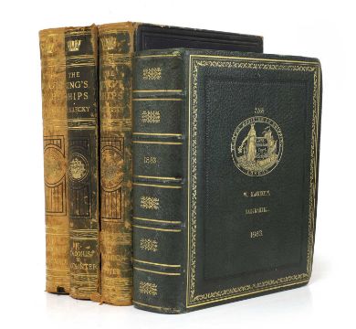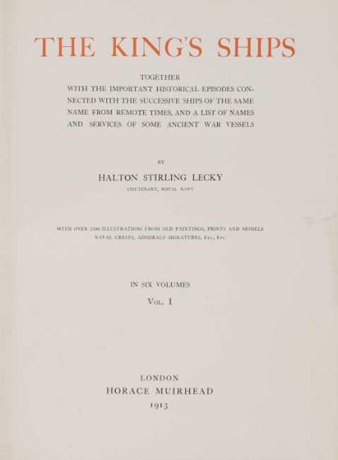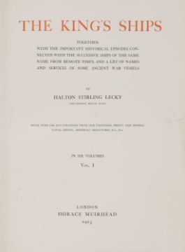 The KING'S SHIPS. 3 volumes [All Published], London, H. Muirhead, 1913-1914. (Was supposed to be in 6 vols. But due to the war, only 3 vols were published and never continued). Original full leather gilt, t.e.g. 4to. Covers rubbed; Lloyd's Register of British and Foreign shipping. From 1st July 1883, to the 30th June 1884. London, Wyman & Sons, 1883. Original full leather with gilt emblem and 'W. Mackinnon, Balinakill, 1883' in gilt to upper cover (4)