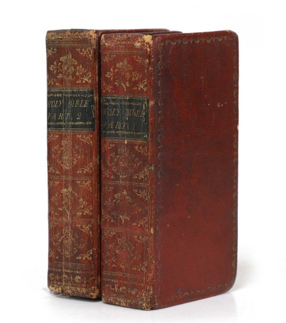 newly translated out of the original tongues and with the former translations diligently compared and revised by His Majesties special command, in Two volumes. L, C Bill, H Hills & T Newcombe, 1684. With two title pages, one engraved, plus a total of 61 plates in the Old Testament & 28 Plates in the New. Bound With: The Book of Psalms: Collected into English Metre, by Thomas Sternhold, John Hopkins, and others. L, Printed for the company of Stationers, 1683. (12.8x6.5 cm). Matching cont. full red leather with gilt decoration to covers spines and all edges gilt. Few tears and small loss, including a couple of the plates (2)