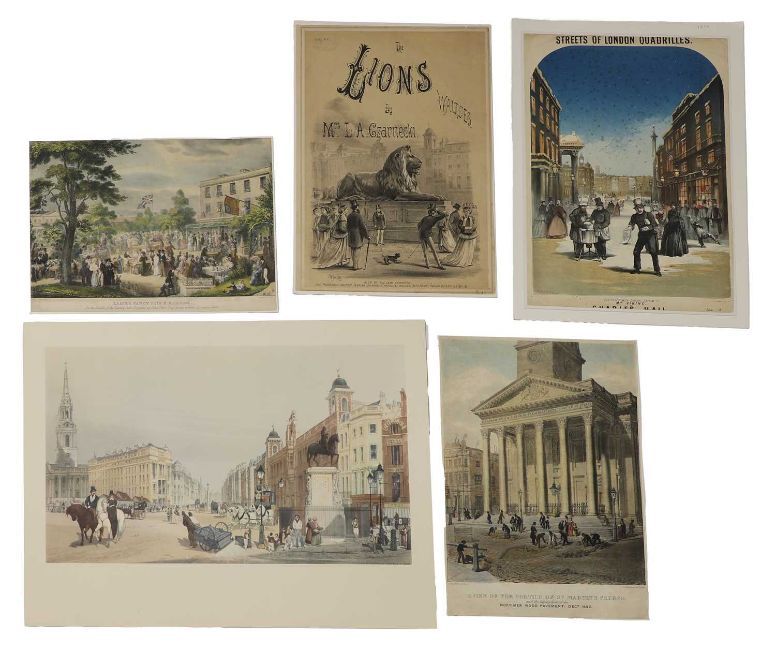 Six coloured lithographs: The Coronation of Queen Victoria, 1838; Pollock’s scene in 'Jack the giant killer'; a London street party; Ladies fancy fair & bazaar; view of the portico of St. Martin’s church, 1842; Streets of London Quadrilles, 1873; & a music sheet cover; Plus: 9 others (2 not coloured). (15)