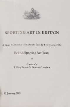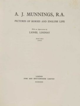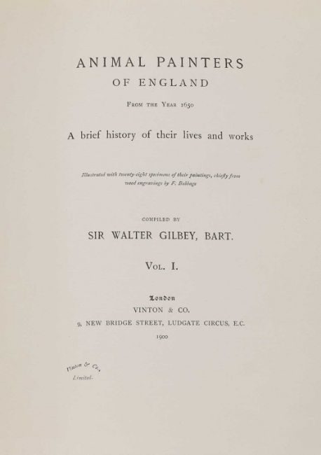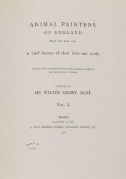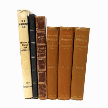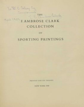 The F. Ambrose Clark Collection of Sporting Paintings, with commentary & notes by E.J. Rousuck. Printed for His Friends, New York, 1958. Limited edition of 250 copies, the title page inscribed: 'To W. C. Selway Esq. compliments of F. Ambrose Clark'. 4to. Full leather, with a Christmas greetings card from Brose and Meg Clark pasted to front pastedown and endpaper; Gilbey, Sir Walter: Animal Painters of England From the Year 1650. A brief history of their lives and works. 3 vols. Vinton, 1900-1911. 1st. Edns. Original boards; Munnings, A. J: Pictures of Horses and English Life. 1939, 2nd. Edn. DW; Sporting Art in Britain: A Loan Exhibition to Celebrate Twenty Five Years of the British Sporting Art Trust at Christie's. Newmarket, British Sporting Art Trust, 2003. Folio, Beautifully bound in 3/4 morocco over marbled boards, with a gilt lettered title to upper cover. Fine. (6)