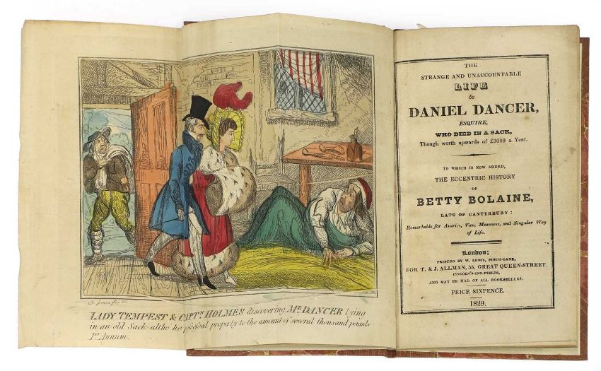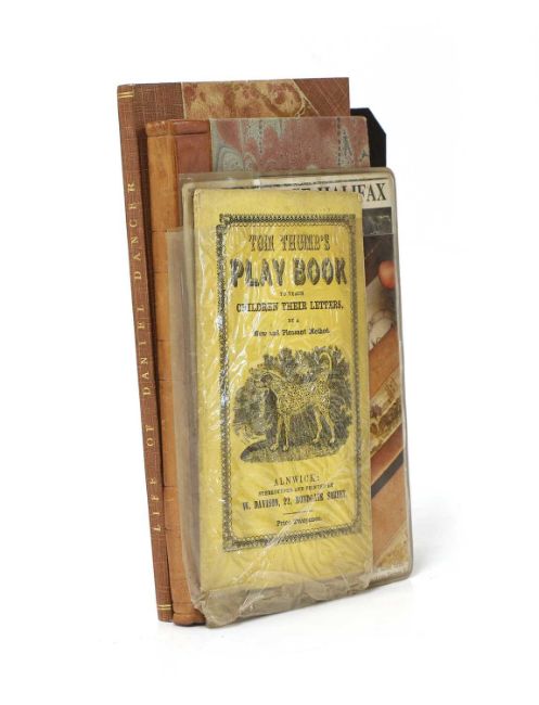 who died in a sack, though worth upward of 3000 a year; To which is now added, The eccentric history of Betty Bolaine. Allman, 1829, first Allman edn. 28pp plus a folding hand coloured engraved plate. Later cloth backed marbled boards, with the original wrappers bound in. VG; [BEWICK, Thomas] ill: Tom Thumb's Play Book to teach children their letters, by a new and pleasant method. Alnwick: W. Davison, no date, c1825. Original pictorial paper covers, 35pp; [Defoe, Daniel]: The Exploits of Robinson Crusoe, Mariner of York. Printed for the Booksellers [Ca 1775]. PP: Engraved Frontis plate, (3)-132, with 19 text illustrations. Later leather backed marbled boards. Tear to one page, with the loss of a couple of letters; pages unevenly trimmed, hence some a lot shorter than others. (3)