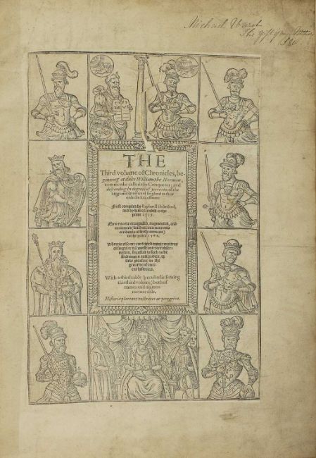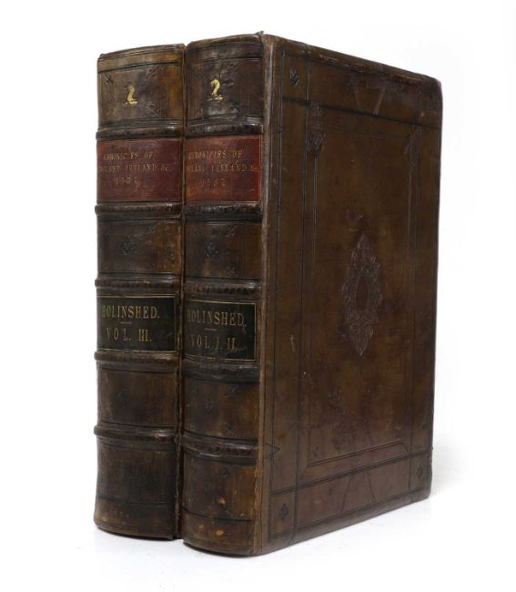 The First and Second [and Third] Volumes of Chronicles, comprising 1 The description and historie of England, 2 The description and historie of Ireland, 3 The description and historie of Scotland... to the yeare 1586 by John Hooker aliàs Vowell Gent. London: [H. Denham] at the expenses of John Harrison, George Bishop, Rafe Newberie, Henrie Denham and Thomas Woodcocke, 1587. PP: (viii), 250, 202, Title of second volume, 1586. m(viii), 9-61, (i) Blank, (x) dedication, 1-183, (1) blank [damp stains to margin of some pages]; Scotland titlE, 1585, 1-464, (LIV) Table. Colophon: finished in January 1587; Vol.3: Title (trimmed and laid down; dedication page trimmed. PP: (iv), 1-1592, (ii) blank (Lviii) Table. Colophon: January 1587. The edges of the last 3 leaves of table trimmed and mounted; a couple of worm holes to the last 7 leaves. Folio, 38 x 27 cm. Later full leather with embossed decoration. [The second edition of the Chronicles, used by Shakespeare as a source for many of his plays, including: The second edition of the Chronicles (2)