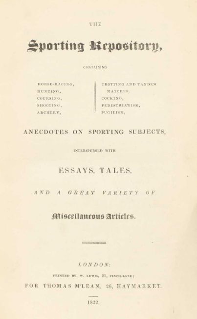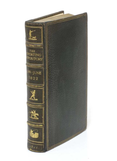 The Sporting Repository, containing Horse Racing, Hunting, Coursing, Shooting, Archery, Trotting and Tandem Matches, Cocking.. Contains all six numbers (All Published), Bound in One Volume. L, Thomas McLean, 1822, 1st. Edn. With all 19 beautiful hand-coloured aquatint plates. 540pp. Later full leather with gilt decoration & lettering to spine, gilt ruling to boards, elaborate gilt inner dentelles and top edges gilt. With the Armorial bookplate of 'Sir William Bass, Bart' and the morocco name plate of 'Alfred Barmore Maclay' to front pastedown. A beautiful copy.