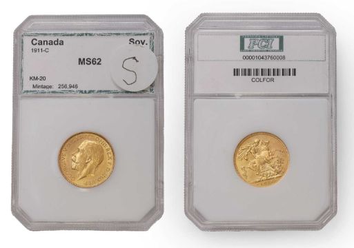 Sovereign, 1911, C in ground for Ottawa Mint, PCI slabbed and graded MS62