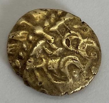 Selsey two-faced gold Stater, c.50 BCE, uninscribed issue, Bagnor Cogwheel type, degraded head of Apollo right, rev. triple-tailed horse right, flower above, pellet-in-annulet in front, cog and pellet-in-annulet below, 6 grams, VF or better
