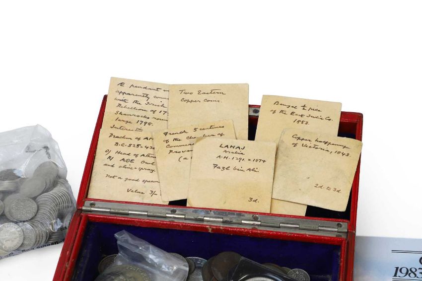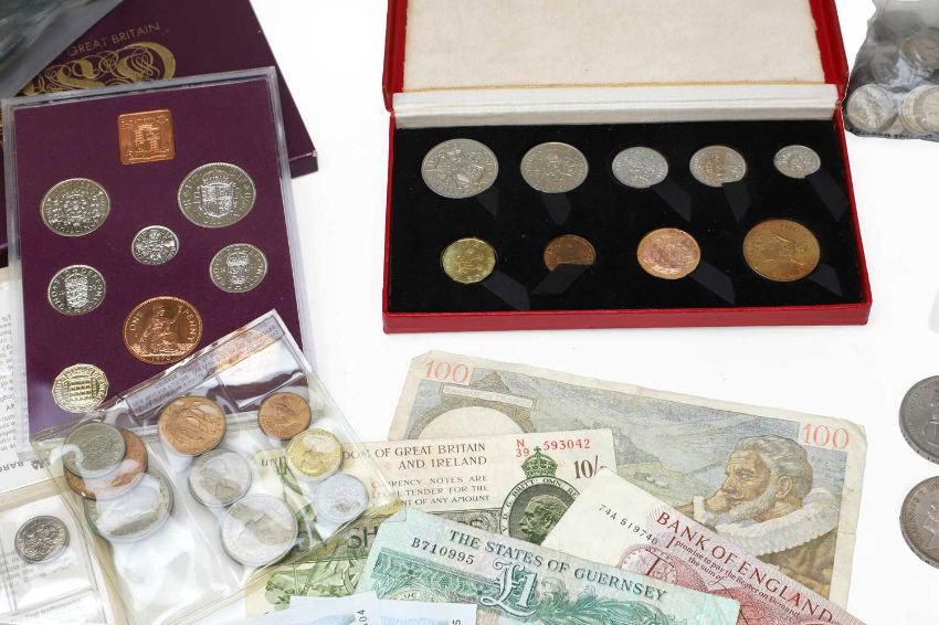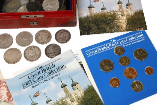 a selection of coins comprising an 1881 US silver Dollar, New Orleans Mint, F, an 1891 Crown, F, 2 x 1887 Double Florins, both F, a 1950 Proof Set, in case of issue, 2 x 1983 Great British Coin Collections, together with assorted other coins and banknotes