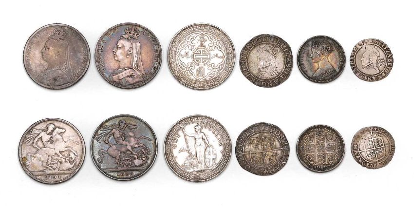 a selection of coins comprising an Elizabeth I Shilling (S.2555, type 3A), NF, a 1580 Sixpence, NF, an 1849 'Godless' Florin, NVF, a 1929 Trade Dollar, NVF, together with assorted silver Crowns, Shillings etc.
