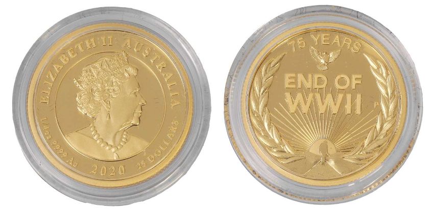 1/4oz Gold Proof Coin, 2020, Commemorating the 75th Anniversary of the End of World War II, in capsule with certificate and case of issue