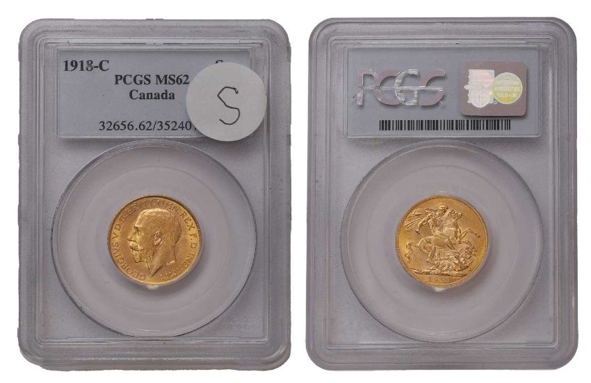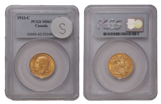 Sovereign, 1918, C in ground for Ottawa Mint, PCGS slabbed and graded MS62