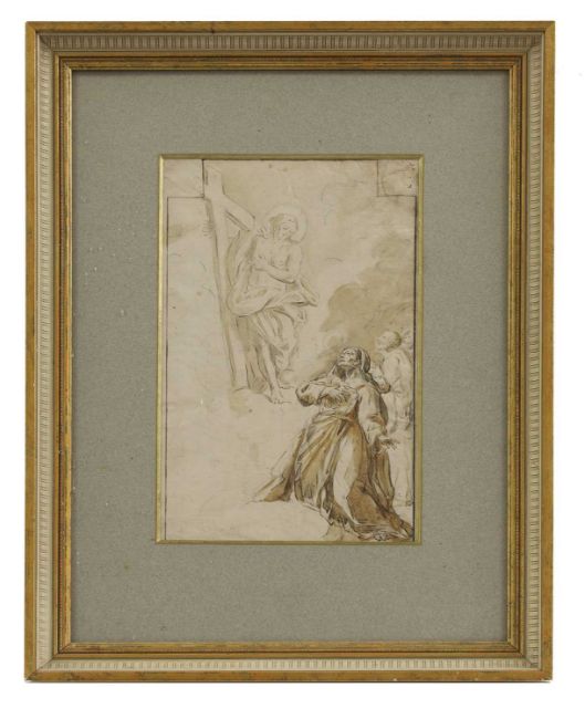A female saint kneeling before Christ holding the cross