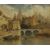 A northern riverside town with figures by a bridge and others in a punt in the foreground