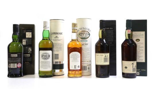 comprising Laphroaig, 10 years old, pre Royal Warrant, 40% vol., 75cl. (1 in presentation tube), Bowmore Legend, 40% vol., 700ml. (1 in presentation tube), Lagavulin, 16 years old, White Horse Distillery, 43% vol., 70cl/700ml (1 in presentation box), Caol Ila, 12 years old, 43% vol., 70cl/700ml (1 in presentation box) and Ardbeg, 10 years old, 46% vol., 70cl. (1 in presentation box) - 5 bottles in total