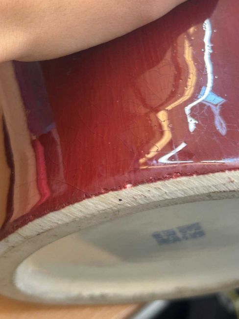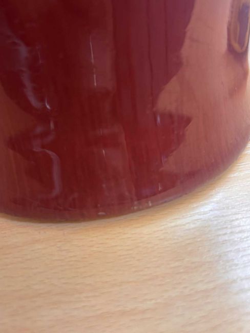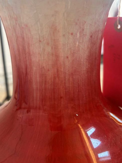 Crazing to the neck of the vase and interior. Hairline crack to the neck and one larger one around the main body. Some pitting to the glaze and markings to the surface. Residue from a label near the base that can be removed with cleaning. Scuffs and minor chipping to the basal rim. Some fritting to the glaze here. The interior with a hairline crack around the base. One area of a glazing fault to the interior where the glaze is thin and crazing has been discoloured in the interior.