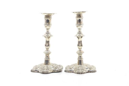 by Hawksworth, Eyre & Co Ltd, Sheffield 1918, each with a shaped base chased with scrolls and rocaille ornament, rising to a knopped baluster stem and spool-shaped sconce, with detachable drip pans, with loaded bases,