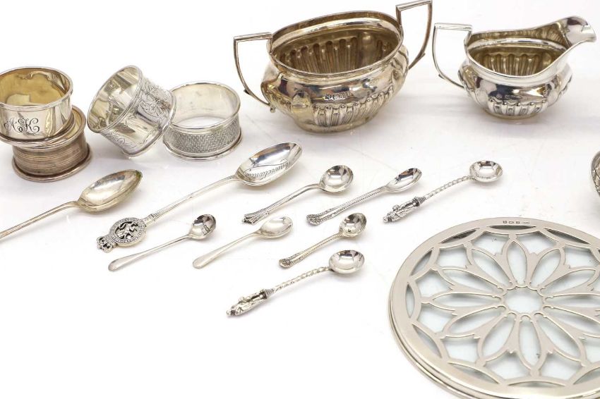 to include, a creamer and twin handled sugar bowl set by James Deakin & Sons (John & William F Deakin), Chester 1901, with gadrooned decoration, a pair of fiddle pattern sugar tongs, by William Rawlings Sobey, Exeter 1844, Engaved 'W' to the handle,14.5cm long, together with a pierced spoon, London 1904, 13.5cm long, and a pair of pepperettes, by Docker & Burn Ltd, Birmingham 1925, 6cm high (qty.)