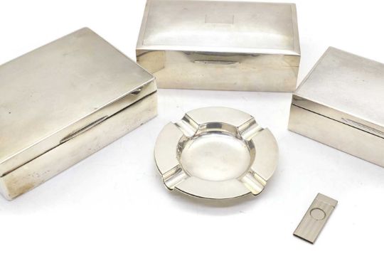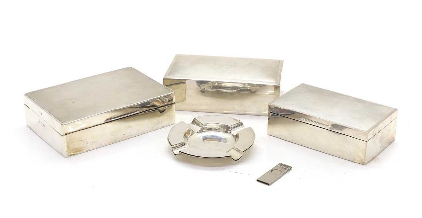 the largest by William Bruford & Son, London 1936, 16.5cm wide, 11.5cm deep,14.5cm high, together with a pair of ashtrays by Deakin & Francis Ltd, Birmingham 1963, 11cm diameter (5)