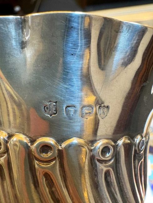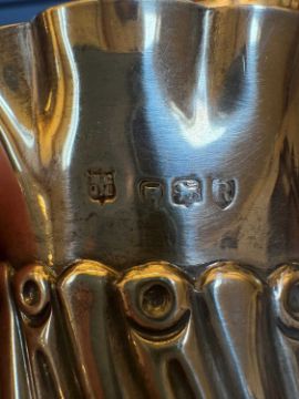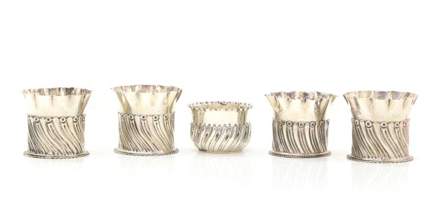 by Goldsmiths & Silversmiths Co (William Gibson & John Lawrence Langman), London 1891-1892, 8cm wide, together with one other similar, by Charles Boyton (II), London 1894, 7.5cm wide, each with fluted rim and gadrooned bases, (5)