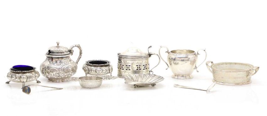 to include a shell form butter dish, by Walter & John Barnard, London 1889, with conch shell feet, engraved with a peasant, 10.5cm deep, a pair of Victorian salts, by Henry Holland (of Holland, Aldwinckle & Slater), London 1857, with repoussé decoration, 8.2cm wide, a mustard, by Peter & Ann Bateman, London 1797, with chased decoration and blue glass liner,10.5cm wide, together with a twin handled salt, 13cm wide, and a strainer, 12.5cm wide (qty.)