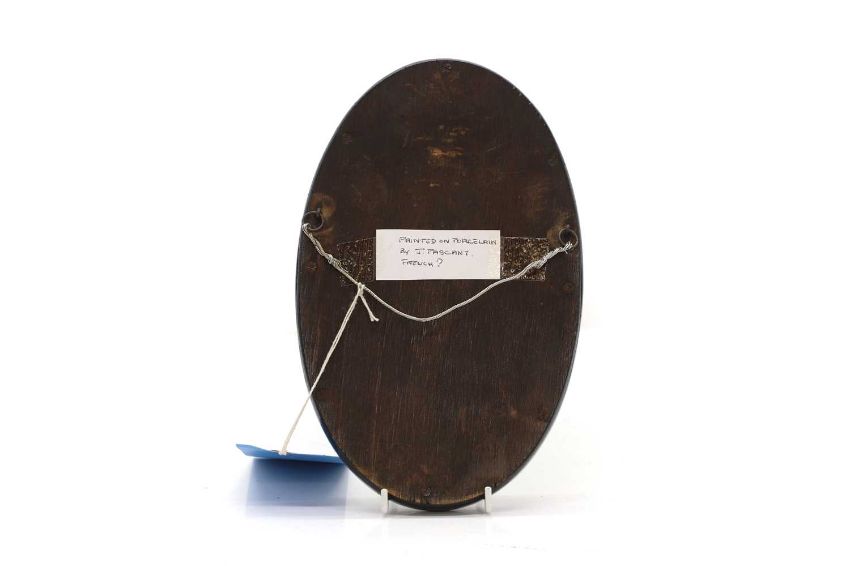 20th century, of oval form, painted with a lady in a white dress with a lilac shawl, standing at the water’s edge amidst reeds and foliage, her straw hat discarded beside her, mounted within a black ebonised frame, signed l.r., 'J.Pascant',