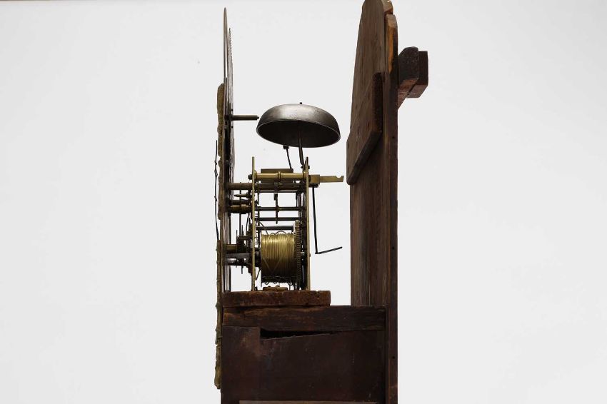Evidence of repair, alteration and later elements to the hood, with general knocks, surface wear, splits, losses and repairs to the case throughout, the cheeks appear to have been built up indicating that the movement and case are associated, general detritus, wear and discolouration to the face with possible repainting to the moon phase, joints are sound and solid and overall the piece presents in fair cosmetic order, please contact the department for further comment on the movement and mechanical condition