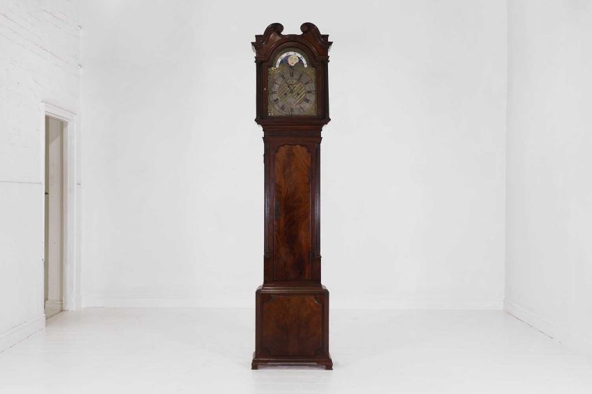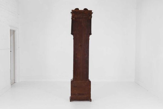 third quarter of the 18th century and later, the columnar hood with an arched glass door enclosing a 13-inch brass dial with a silvered chapter ring, subsidiary seconds dial, moon phase dial and rococo spandrels, inscribed ‘W Holliwell, Liverpool’, with an eight-day movement striking on a bell, the trunk with blind-fret decoration, quarter columns and a shaped long door, above a panelled base and squat ogee bracket feet,