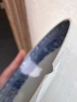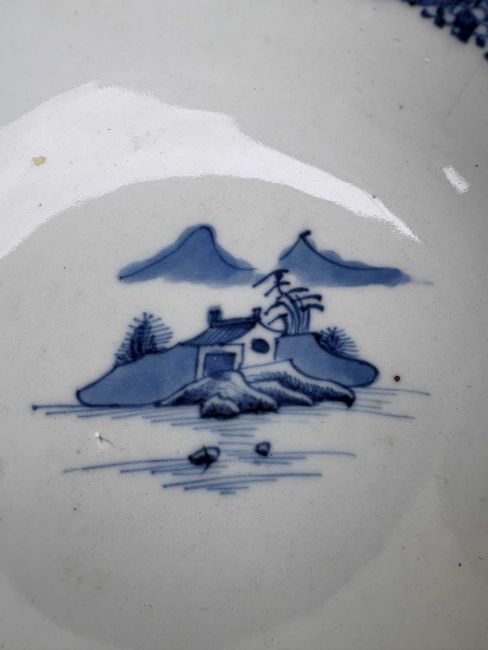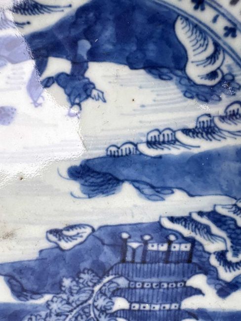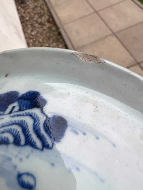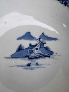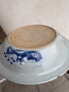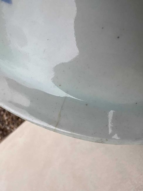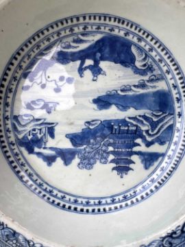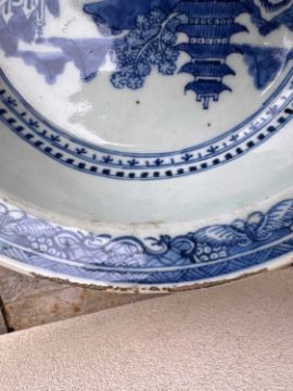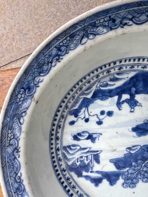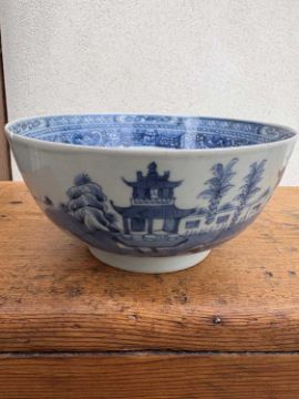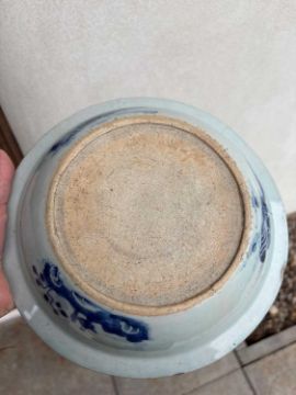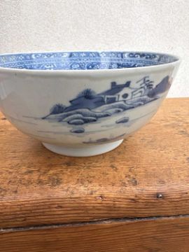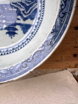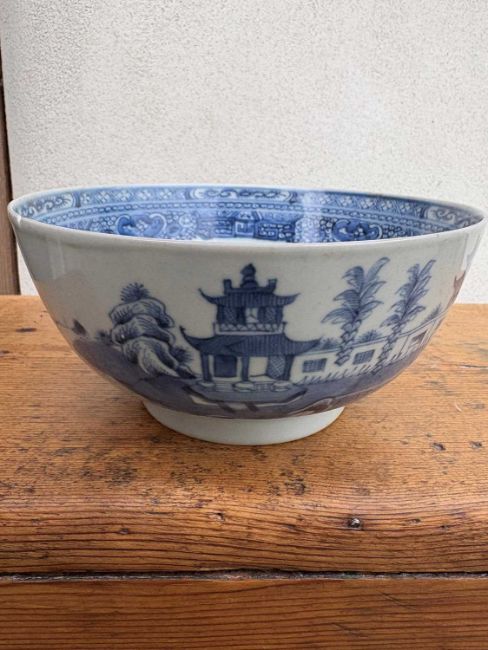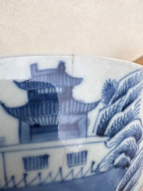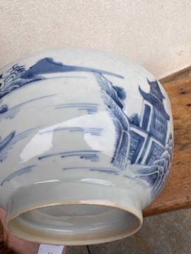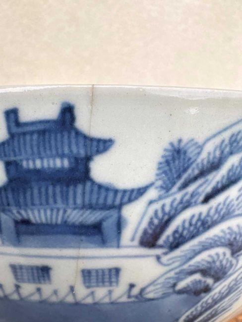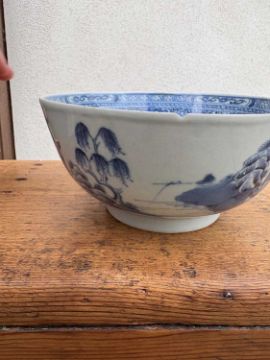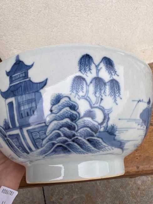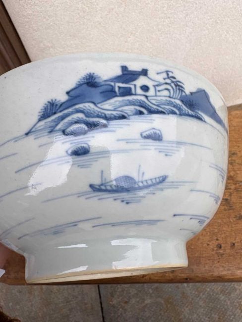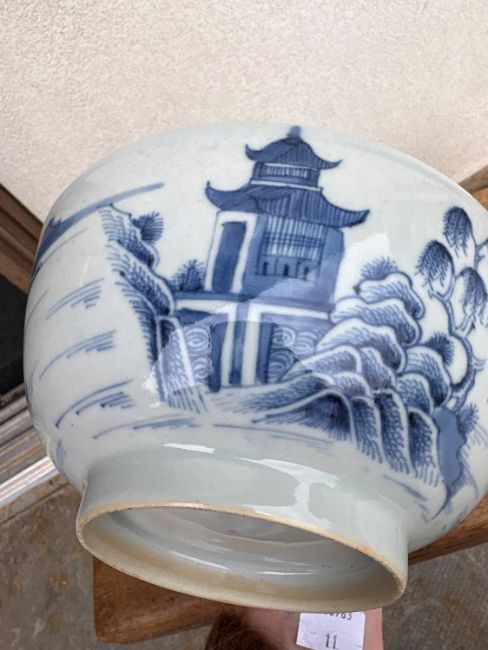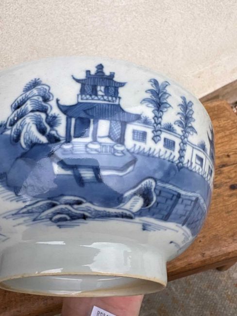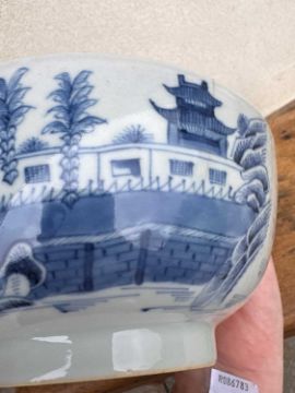 Blue and white bowl) with a hairline crack from the rim radiating down 5cm. Chips and nibbles to the rim. Foot rim with kiln pickup.
