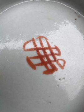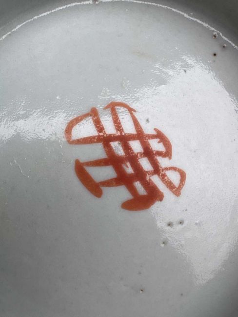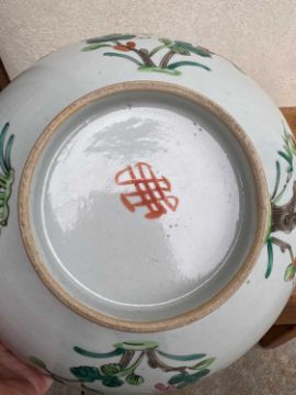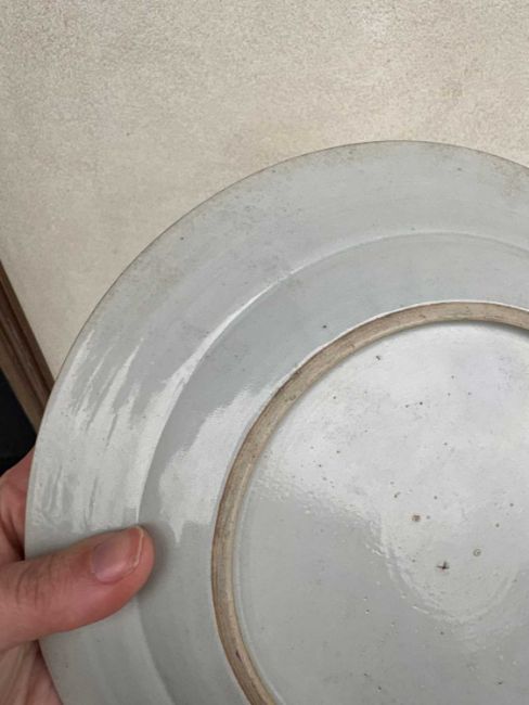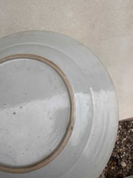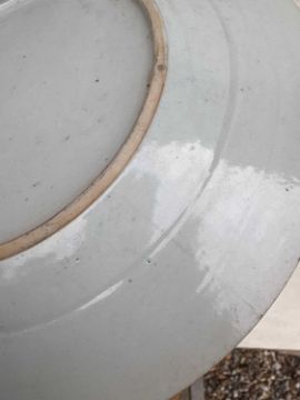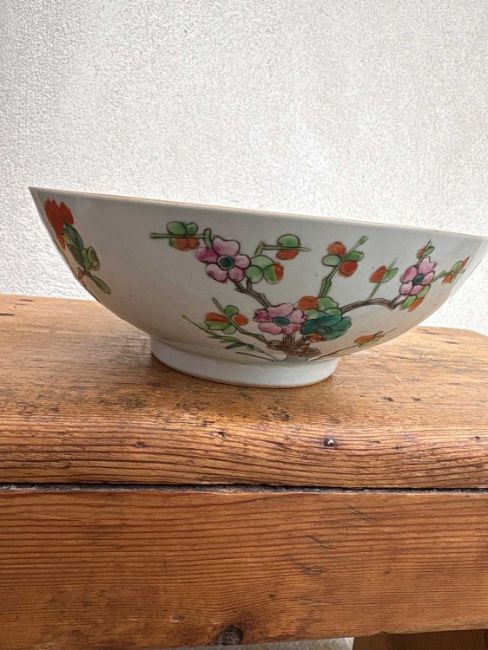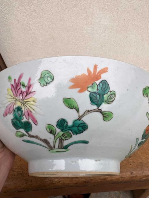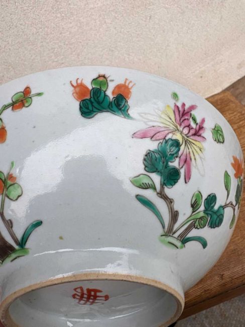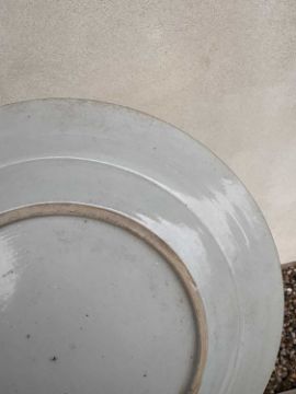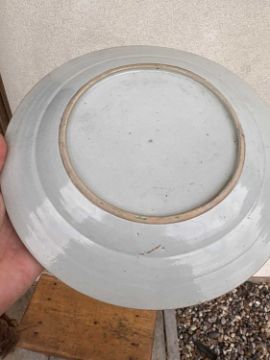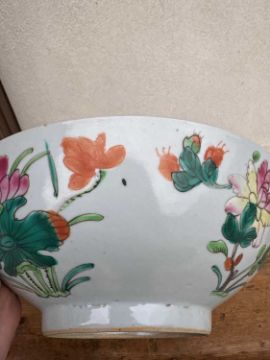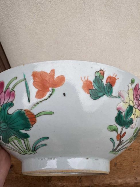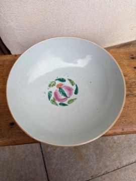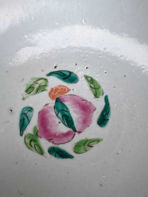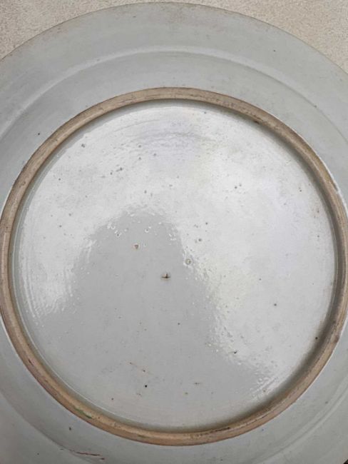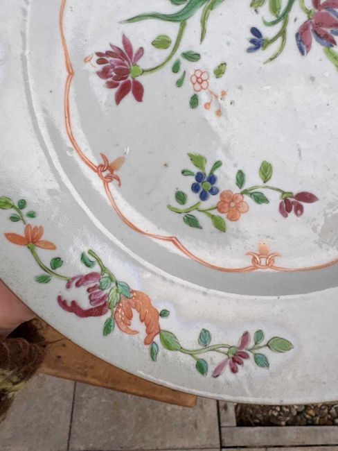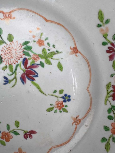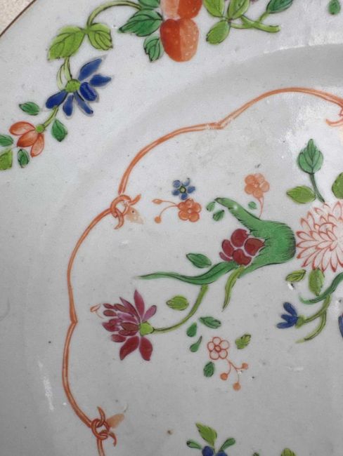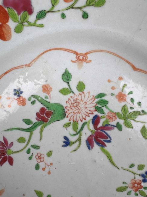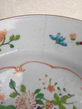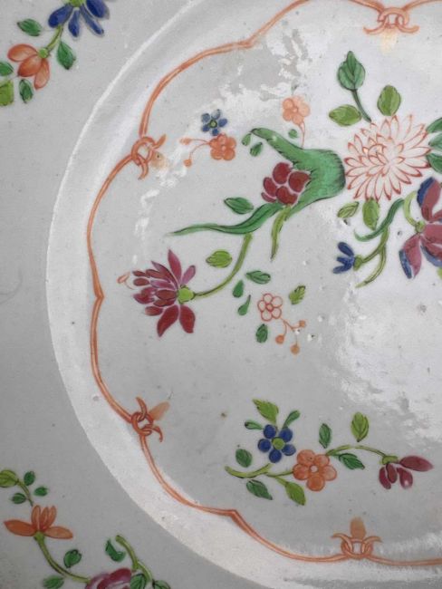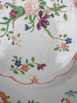 Famille Rose shallow dish) with a hairline crack from the rim 5.5cm long. Chips and nibbles to the rim. Kiln pickup.