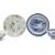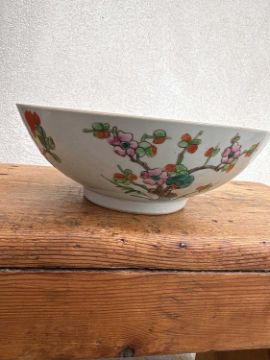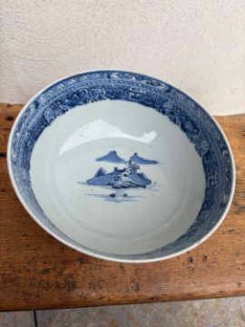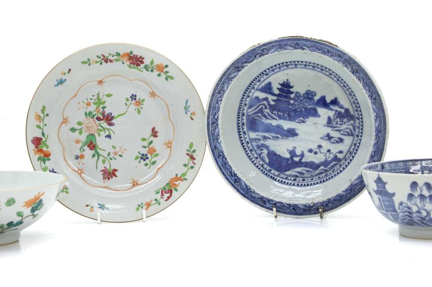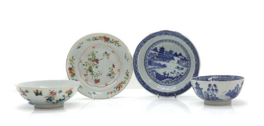 19th century, comprising a blue and white bowl, the interior decorated with a central roundel depicting a riverside pavilion in a rocky landscape, encircled by a broad band of trellis diaper and ruyi head motifs, the exterior painted with a continuous river landscape of pavilions among trees and rocky outcrops, beneath mountains,17cm diameter, a Famille Verte bowl, the exteroir with large flowering peony, lotus flower, chythamum, and prunus, the inteiror centred with a medallion of leaves encircling a peach, in polychrome, with underglaze mark to the base, 20.7cm diameter, together with a 23.5cm diameter a blue and white basin, the inteior decorated with two figures within a river landscape, framed by pavillions and trees beneath distant mountains, the border with scrolling foliate, the exterior decorated with similar scenes, base unglazed, 23.5cm diameter, and a Famille rose shallow dish, decorated with a central bouquet of cythsanthamum and peony within a scroll border, the rim with scattered floral sprays, in polychrome, 23.2cm diameter (4)