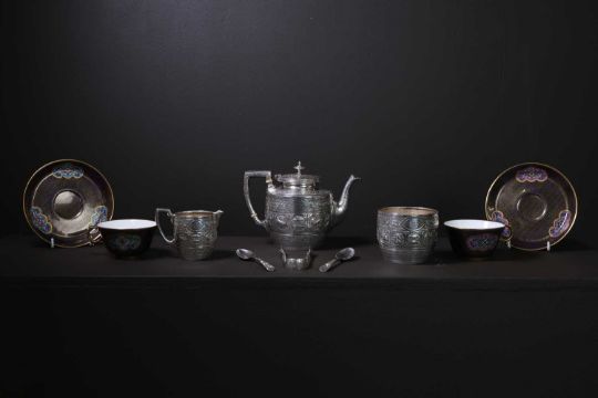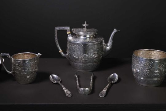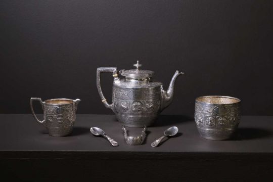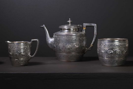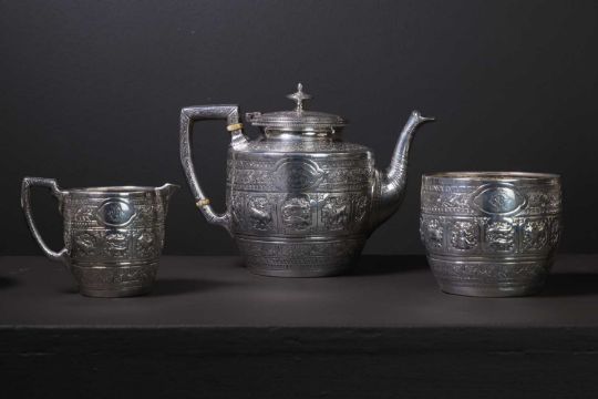 each decorated with a band of shaped reserves containing repoussé figures and animals, within densely applied bands of scrolling foliage, each with monogram, the teapot with a crest inscribed 'A Silver Wedding Gift from Walter Macfarlane to Mrs Andrew and Mr Onie[?] 25th March 1881', with ivory insulators,
