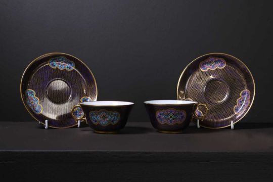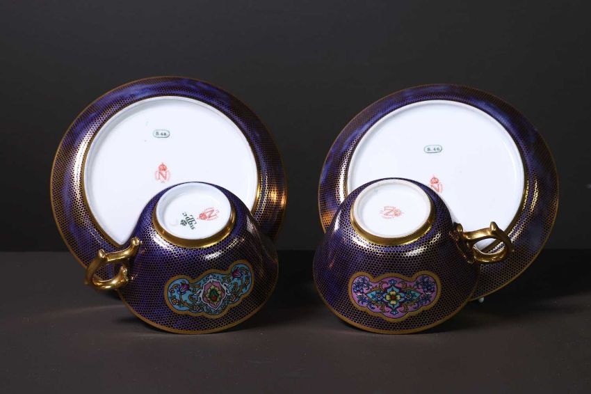 with two porcelain teacups and saucers, each decorated with a shaped reserve containing floral scrolls, within a gilt trellis over a dark-blue ground, crowned 'N' and 'Décoré à Sèvres' stencilled in red to each, with '61' to the cups and '56' to the saucers, 'S.48' stamped in green to the saucers, 'SV. 47.' mark in green to one cup,