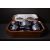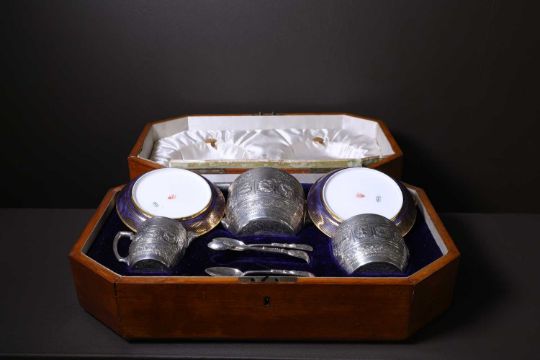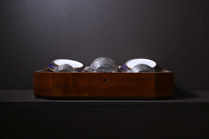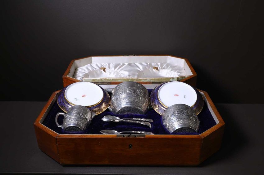 The porcelain in good condition overall. A few small nibbles to the plates' feet. Silver in good order, expected wear and surface scratches. Marks clear. The case with age-related wear and polished-in marks, but structurally stable.