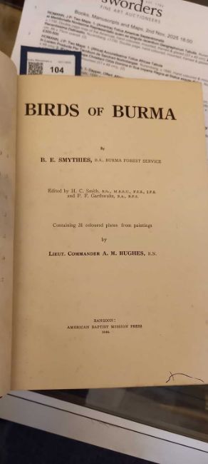 American Baptist Mission Press, Rangoon, 1940, 1st. Edn. 31 colour plates after A. M. Hughes including frontispiece, captioned tissue-guards, folding map to rear & corrigenda leaf. Beautifully bound by Sangorski & Sutcliffe in full red morocco with raised band, gilt ruling, marbled endpapers & all edges gilt. Fine copy of a rare book: Most copies were captured by the Japanese and shipped to Japan and subsequently were destroyed during the allied bombing of Japan. With a copy of a letter (tipped-in at the front), from the Liaison committee (Tokyo), dated 20 Nov 1945 explains all that. Armorial bookplate of 'Alan Francis Brooke' to the front pastedown. Fine Copy