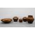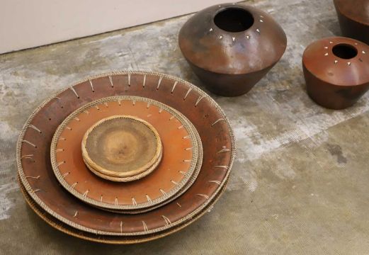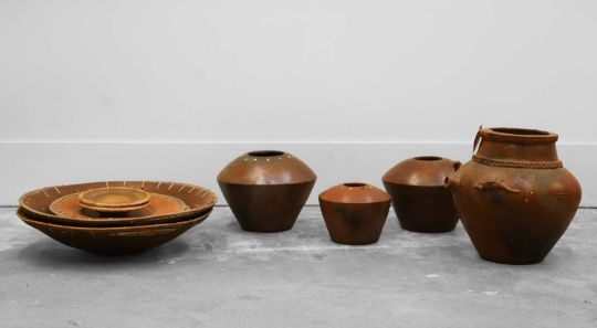 comprising of four red clay dishes with woven rattan rims, the largest 51cm diameter, two further small plates with tightly woven rims and stepped foot, 18.5cm diameter, three red clay pots with inlaid bone triangular decoration, the largest 24cm high, together with a larger hand-sculpted water carrier, decorated with lizards, 32cm wide (10)