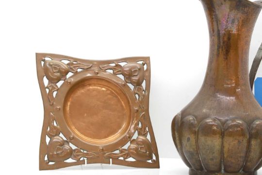 together with a copper dish of square form with a circular recess