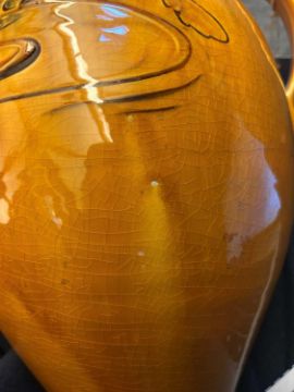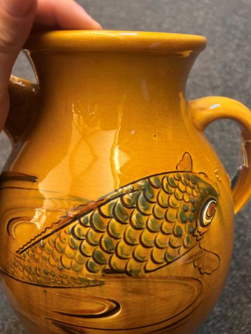 Condition ReportFish jug - crazing to the glaze throughout. Some kiln faults and pitting. Chipping and loss to the spout. Some marks to the surface throughout. Chip to the glaze on the basal rim. Some roughness to the base.