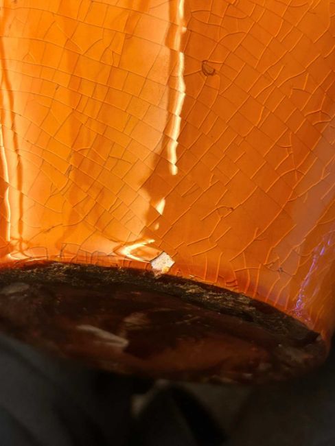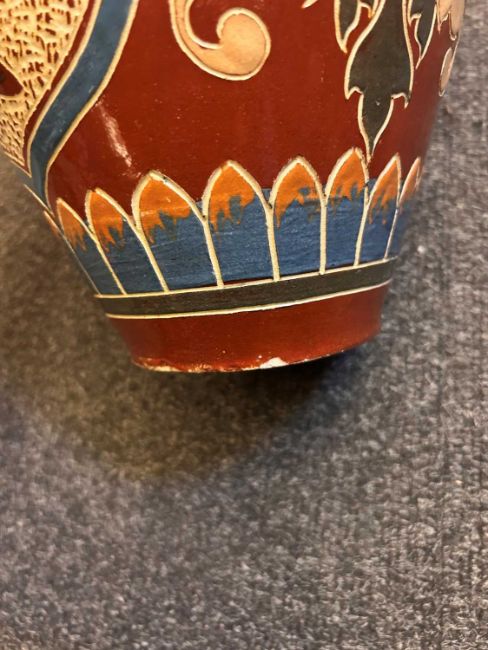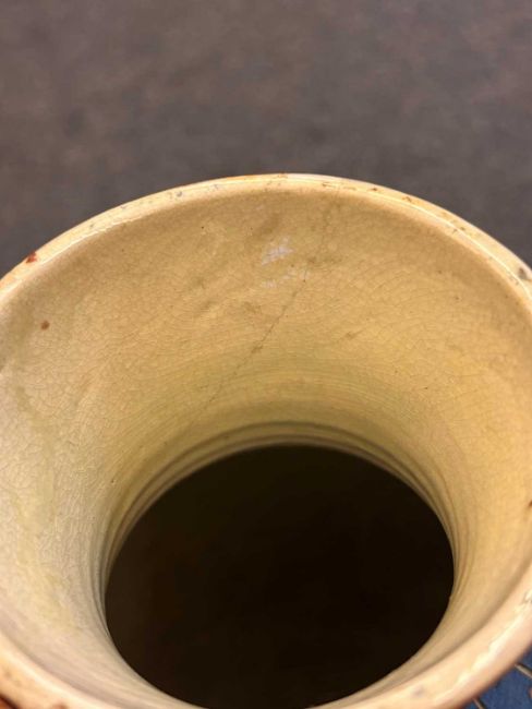 CH Brannam vase - Hairline crack running down from the rim and a repair to the rim. Chipping to the base and roughness in this area. Some glaze faults to the exterior. Some rubbing to the glaze