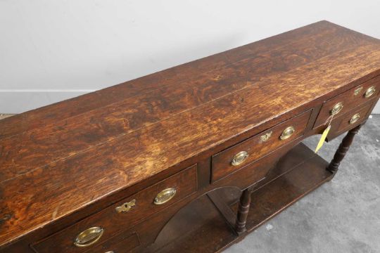 18th century, the plank top above three frieze drawers and a further two smaller drawers, on turned supports with potboard base,