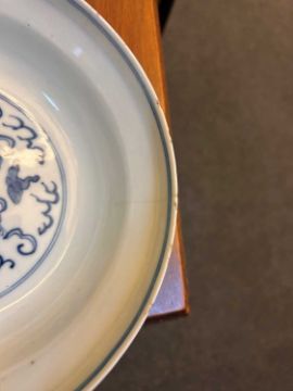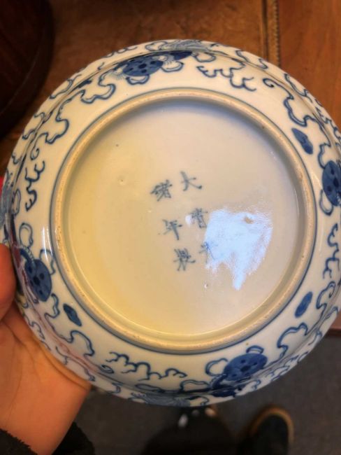 Qing Dynasty (1644-1912), decorated with a dragon to the central field with double blue ring border, six blue character mark to the base,